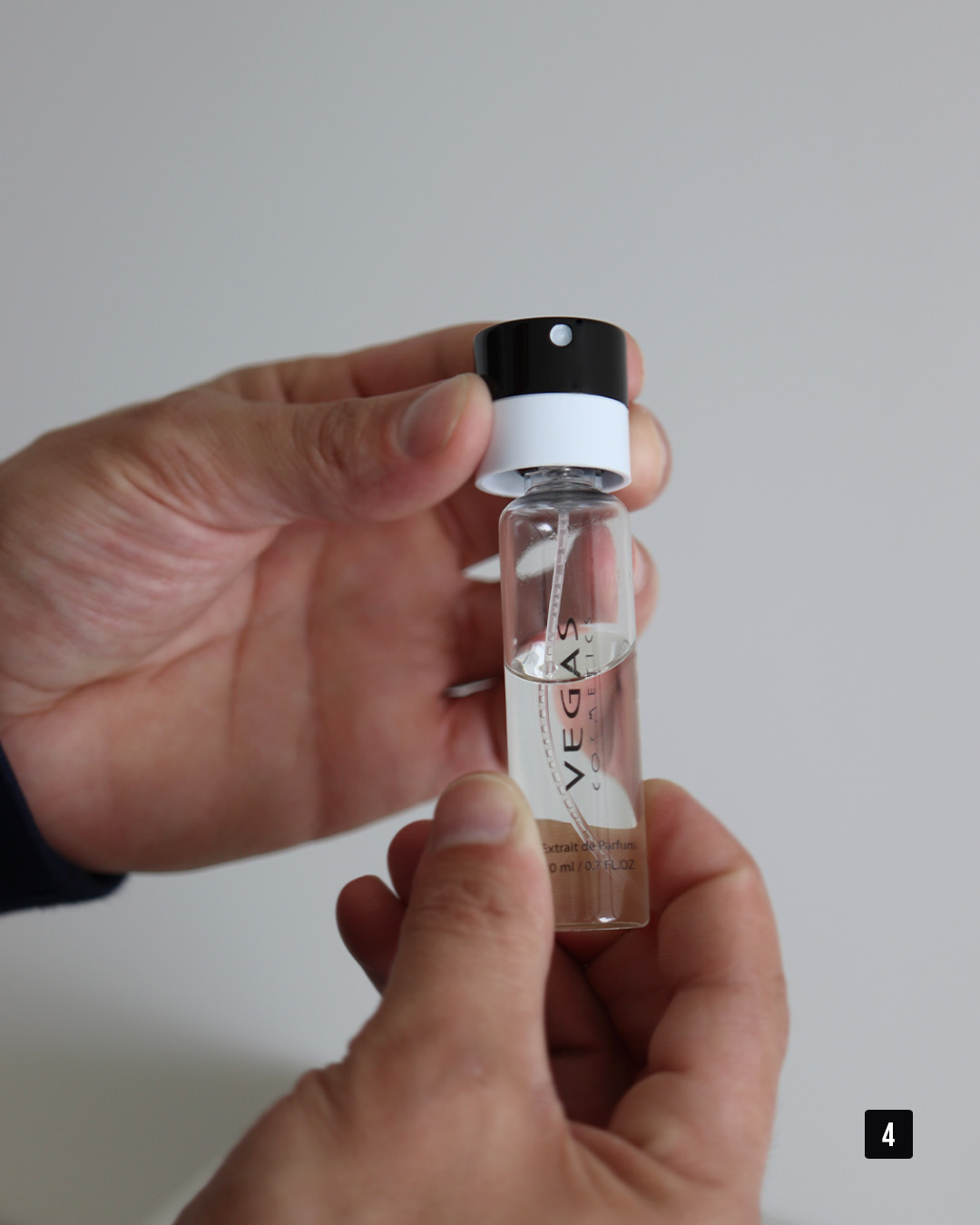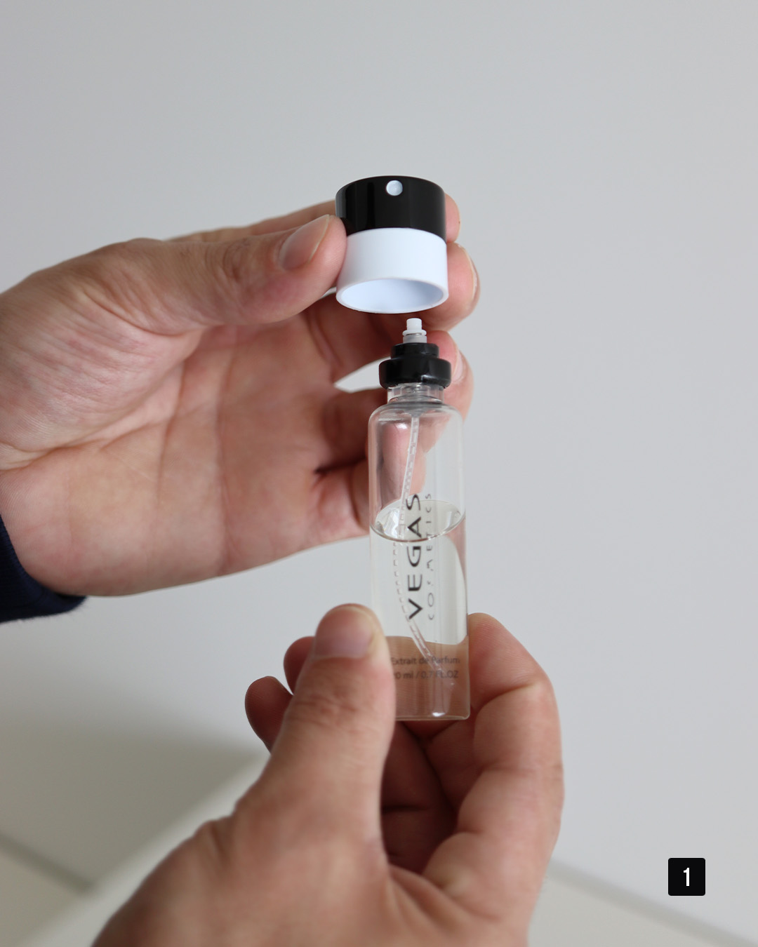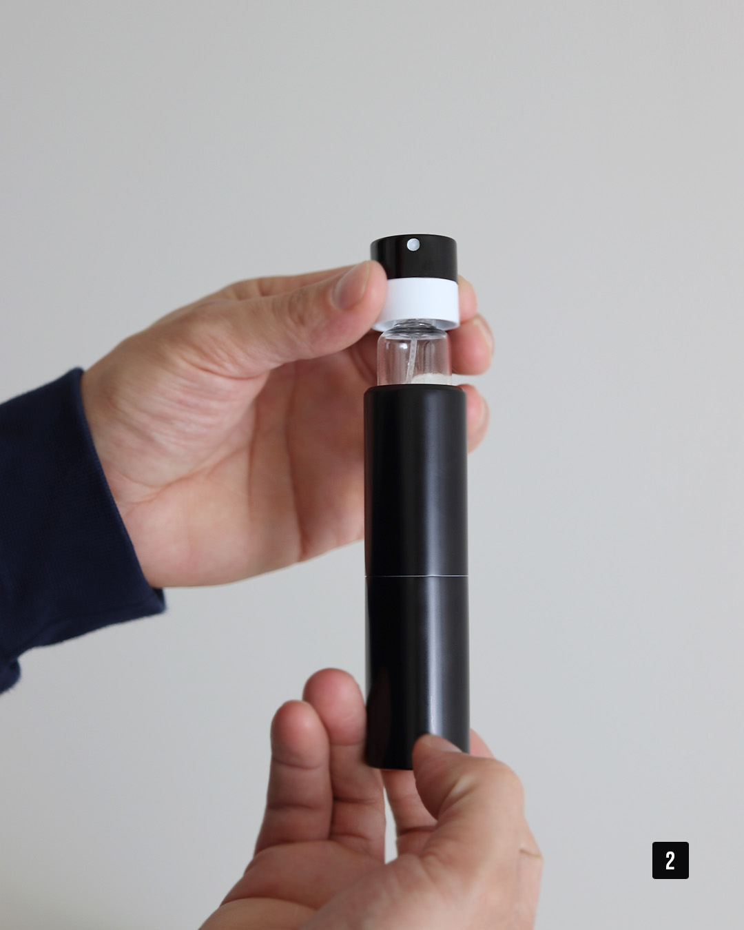1. Installez la recharge sur la tête de pulvérisation du Parfum Case (Réf. 106).